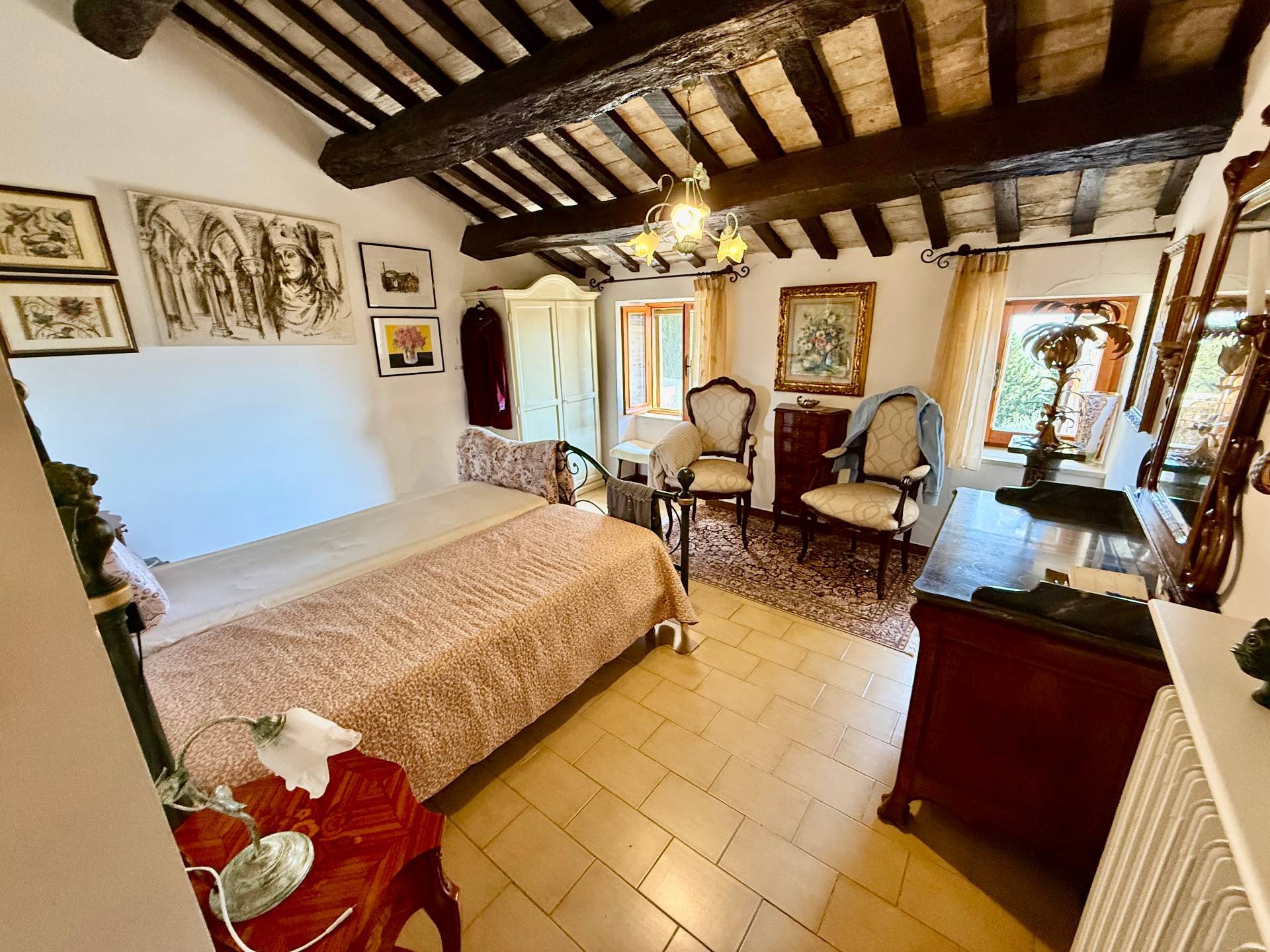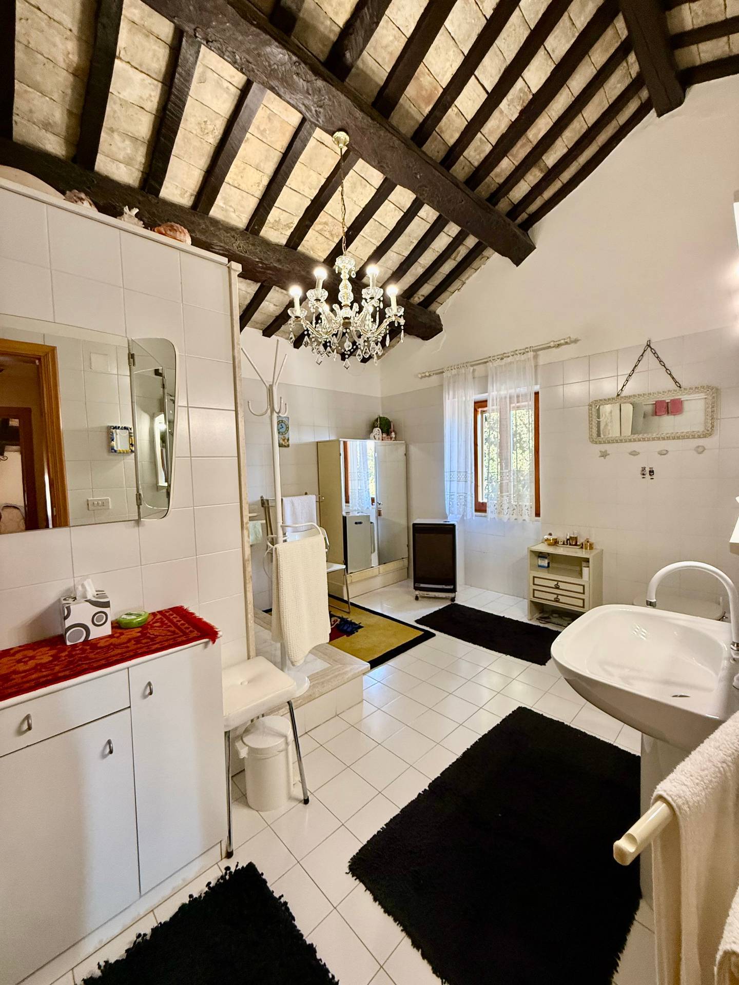 Al primo piano la propriet dispone di un balcone con splendida vista panoramica che spazia dalle colline fino al mare. Gli ambienti del piano superiore conservano tutto il fascino originario grazie agli splendidi soffitti con travi in legno a vista, che conferiscono calore, eleganza e autenticit agli spazi. Completa la propriet un suggestivo terrazzo sul tetto di circa 40 mq, un autentico punto di forza del casale, dal quale si gode una vista aperta e mozzafiato sul mare e sui monti circostanti, ideale per momenti di relax, cene allaperto e tramonti indimenticabili.